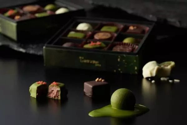 ラインナップするチョコレートは、抹茶ガナッシュを詰めたホワイトチョコレートの上からさらに抹茶チョコレートをコーディングした“抹茶チョコ×抹茶”や、ジャンゥーヤを加えたほうじ茶ガナッシュにビターチョコを合わせた“ビターチョコ×ほうじ茶&ジャンドゥーヤ”など。中には、苺と抹茶を掛け合わせた“抹茶チョコ×苺&フィアンティ―ヌ”も登場する。