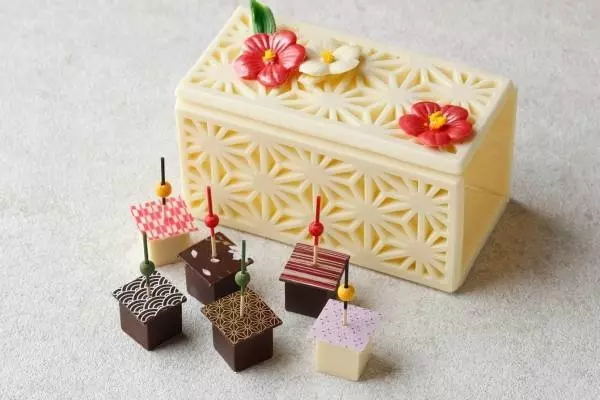 桜ピスタチオや杏紅茶など6種類の和柄ボンボンショコラを詰め込んだ「組子・和撰」と、柚子、ほうじ茶など4種類の和柄タブレットチョコレートをセットにした「組子・和札」は、チョコレートでできた組子ボックスが魅力。ボックスの上にあしらった椿の飾りまでもチョコレートで作るというこだわりようだ。