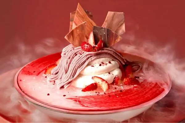 ベースには、半熟の生カステラや、生レモンカードクリーム、新鮮な苺を使用。その上に、天然由来のピンク色をしたルビーチョコレートを組み合わせたジューシーな苺のとろけるモンブランクリームをたっぷりと絞った。