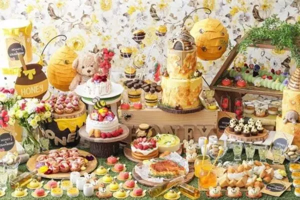 ポップでファンタジックなブッフェ台に並ぶのは、ハチの巣に見立てたレアチーズやミツバチをイメージしたマカロン、クマをかたどった“もふもふ”食感のムース、3種のハチミツと各種トッピングを自分で組み合わせて作るDIYパンケーキなど、見ているだけで心躍るキュートなスイーツの数々。