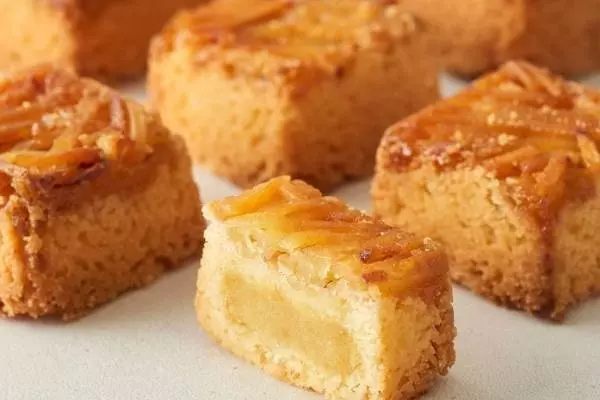 BAKE初のご当地ブランドとなる同店の看板メニューは、工房一体型の店舗で焼き上げた「焼きたて小みかん香る薩摩芋ケーキ」と、箱入りで日持ちする「小みかん香る薩摩芋ケーキ」。しっとりしたサブレ生地に鹿児島県産の紅さつまを使用したみかん風味の芋あんを包み、鹿児島の郷土料理「がね(サツマイモのかき揚げ風)」をイメージした薩摩芋の千切りを乗せて焼き上げた、“ふた口サイズ”の焼き菓子だ。