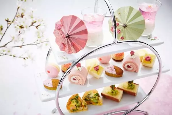 「さくらアフタヌーンティー」は、“庭園のお花見”をテーマにしたアフタヌーンティーセットだ。スタンドの最上段には、桜の舞う和傘をモチーフにしたチョコレート細工をのせて、お花見の気分を演出。ふわふわのチーズケーキにさくらゼリーを重ねたグラスデザートや、ピンク色のさくらロールケーキなど、目にも鮮やかなスイーツを取り揃えた。
