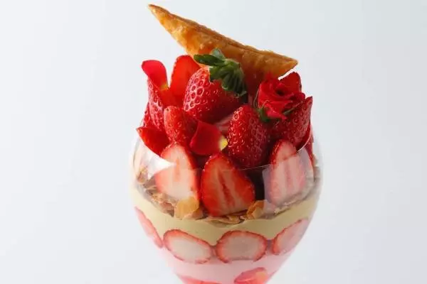 一方で下の段には、砂糖とレモン汁で苺をマリネするというイタリアのレシピを反映。ラズベリーのシャンティとバラの香るレモンゼリー、そして苺のマリネを重ね、苺とバラを存分に楽しめるパフェに仕上げた。