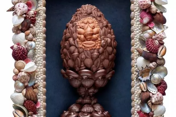 「ラ ファス ド ウフ」は、ショコラ オ レとブロンドチョコレートの2種類から構成された、アーティスティックな貝殻モチーフのエッグ。アルチンボルドの傑作を彷彿させる、顔のようなモチーフが目を引く仕上がりとなっている。台座に乗った美術品のような佇まいの「ノーチラス アヴァラム」はオウムガイをモチーフにした1品。エレガントな渦巻きの造形に注目だ。