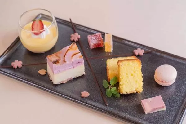 一方「春季限定プレート」は、ピンク色を基調としたスイーツ6種を載せたプレート。「クルミッ子」のキャラメルを使用したプリンやベリーのシブースト、桜のマカロンなど、味わい豊かなミニスイーツを取り揃えた。