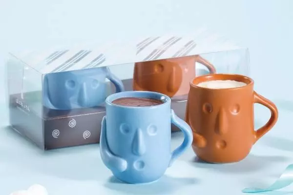 名前の通り“はにわ”をモチーフにしたマグカップが特徴の「はにわぷりん」。ホワイトデー限定バージョンでは、橙色と水色のカップに入れた2種のプリンをセットで用意する。
