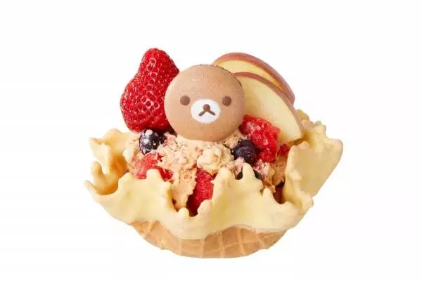 「リラックマのフルーツバスケット」は、今回のために特別に作ったミックスフルーツアイスクリームをベースに、ジューシーなブルーベリーとストロベリーをミックス。トップには、りんごとあまおういちごをのせて、華やかなビジュアルに仕上げた。中央には、リラックマをオン。ワッフルボールは、レモンチョコを施すことで、フルーツの籠のように見立てている。