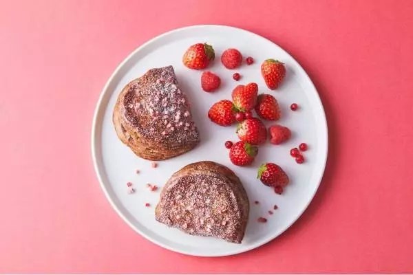 144層からなるサクサク食感のパイ生地は、ベリーとの相性を考え、少しビターなココアを練り込んで焼き上げた。表面にトッピングしたストロベリーピースと粉糖が、春らしい華やかさを演出している。