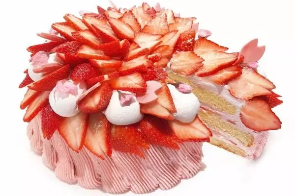 「満開~いちごと桜のショートケーキ~」には、スライスしたいちごを“桜の花びら”に見立てて、贅沢にデコレーションした。トップには桜の花びらを飾り、春気分を盛り上げている。ほんのり和のテイストを感じるのは、香り豊かな桜あんのクリームを使用しているから。ふわふわのスポンジケーキと旬のいちご、クリームの相性は抜群だ。