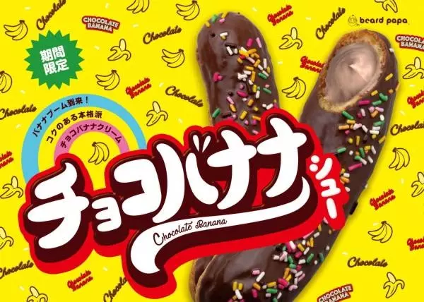 ビアードパパの新作「チョコバナナシュー」は、チョコバナナそっくりなスティック型のシュークリームだ。シュー生地の中に、コクのある本格派チョコバナナクリームをたっぷりと詰め込んで、チョコレートでコーティング。仕上げにカラフルなチョコスプレーを散りばめた。