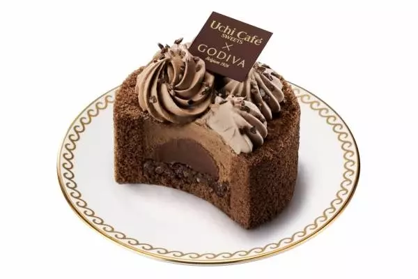 フランス語で“渦”を意味するトゥルビヨン。「Uchi Café × GODIVA ショコラトゥルビヨン」は、チョコムースをチョコレート生地で巻いたロールケーキの上に、渦のようなダークチョコクリームとミルクチョコクリームを絞っている。チョコムースの下のダークチョコガナッシュとトッピングのカカオニブがアクセントとなっている。