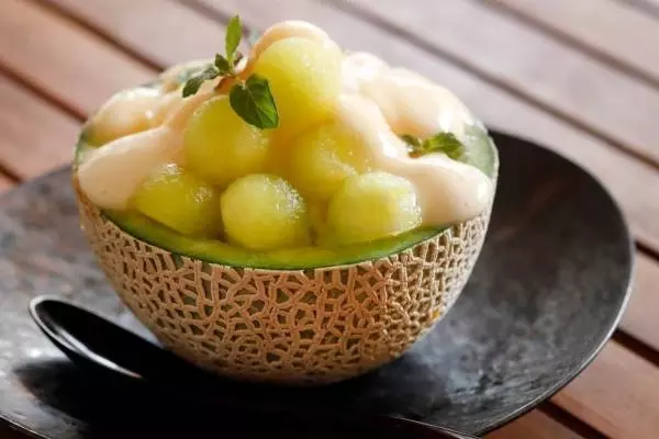 定番の「リッチシェイブアイス メロン」は、“夏の果物の王様”とも称されるメロンをたっぷりと使用したかき氷。芳醇な香りと上品な甘みが楽しめるメロン果肉とミルクシェイブアイスをメロンの器に入れ、赤肉メロンのとろりとしたソースで仕上げた。