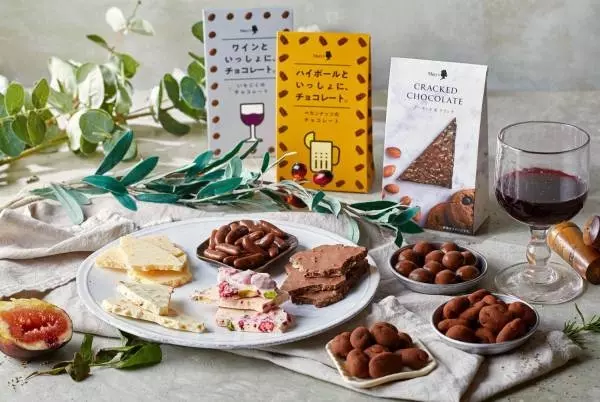 深みのあるマカダミアナッツをミルクチョコレートでコーティングした「ビールといっしょに、チョコレート。」や、ミルクチョコレートでいちじくを包みココアパウダーをまぶした「ワインといっしょに、チョコレート。」などをラインナップする。