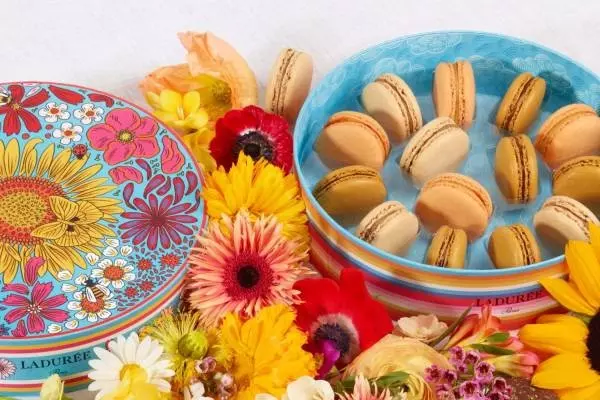 ラデュレの2020年夏限定スイーツのテーマは、その地域で季節の花を生産する“スローフラワー”。サフランやローズ、ラベンダー、ゼラニウムなど、100%自然の花の原材料から作られたマカロンを、花を描いた鮮やかなボックスとともに販売する。