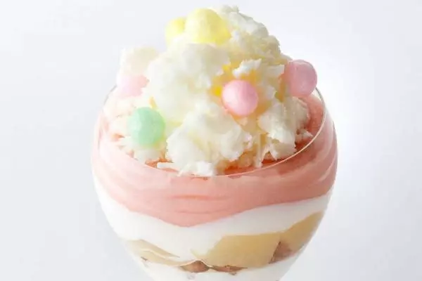 「パステルカラーの乙女パフェ」は、サクサク食感のカラフルな「おいり」をふわふわのミルクかき氷の上にトッピングした、淡く優しい色合いのパフェ。かき氷の下には、フレッシュでジューシーな桃の果実と桃のシャーベットを重ねた。