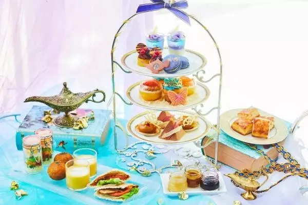 2019年開催時に好評を博した「アラビアンナイト アフタヌーンティー」がリニューアルして再登場。スタンドには、星が輝く砂漠の夜空をイメージしたピスタチオのマカロン、魔法のランプをモチーフにしたステンドグラスクッキーといった「アラジンと魔法のランプ」から着想したスイーツをラインナップ。彩り豊かな見た目も楽しい。