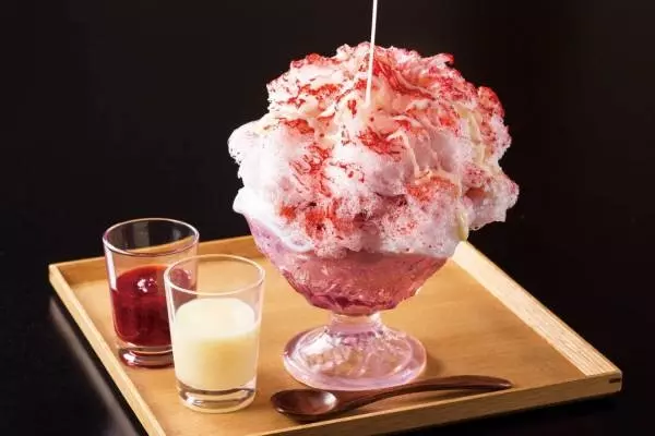 東武ホテルレバント東京のかき氷は、希少な「四代目氷屋徳次郎」の天然氷を贅沢に使用し“綿あめのようなふわふわ食感”を実現。フレーバーは、いちご・マンゴー・抹茶の3種類で、いずれも特製シロップとともに、やさしい甘さの練乳が付属する。色鮮やかなシロップと練乳をたっぷりかけて味わえば、口の中に優しい甘さが広がるはずだ。