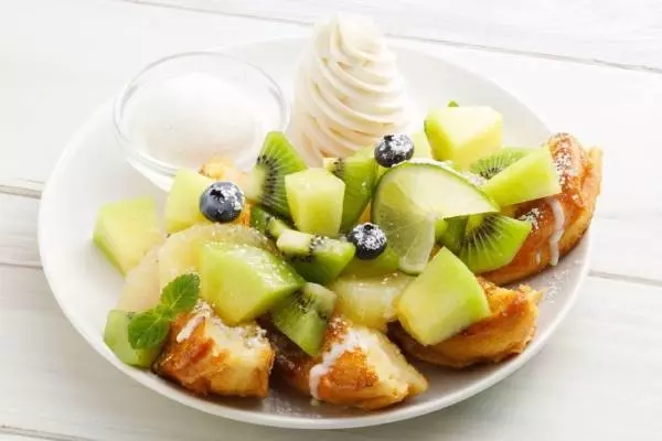 アイボリッシュの夏限定メニューには、フレッシュなフルーツをたっぷりと使ったフレンチトーストがラインナップ。「メロン&ライム」は、ジューシーなメロンとライムシロップに漬け込んだキウイ、グレープフルーツを飾った一皿だ。爽やかなライムシロップと、まろやかなホワイトチョコソースもマッチしている。