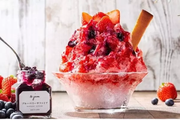 「嵜本のかき氷‐いちごとブルーベリー」は、いちごピューレといちごジャム、コンデンスミルクに 、ジュエルジャム「ブルーベリーサファイア」をのせたかき氷だ。フレッシュないちごをトッピングし、爽やかな味わいに。