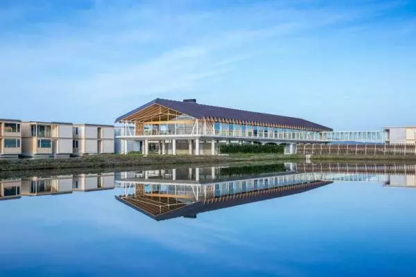 スイデンテラスのある山形県庄内地方は、古来より美しい水を有する地。この周辺環境を活かした田んぼは、人々と常に生活をともにしてきた。土地を象徴する水田にインスパイアされ、田んぼの上に存在するユニークなホテル「スイデンテラス」。新しく掲げるコンセプトは「晴耕雨読の時を過ごす、 田んぼに浮かぶホテル」だ。