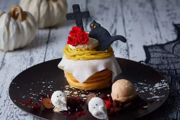 「ハロウィンモンブランパンケーキ」は、黒猫や十字架、おばけなどをトッピングした、ハロウィンシーズンにぴったりのパンケーキ。求肥と和栗のモンブランクリームを重ねたきな粉風味のパンケーキに、ほうじ茶のクリームとアイスを添えて、和の味わいに仕上げている。