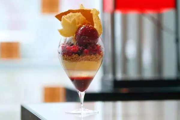 ジェラートやベリーにはメープルシロップをかけ、自然な味の深みや香りをプラス。また、トッピングにはパリパリ食感のパータフィロカラメリゼや、楓の葉を模った薄焼きのクッキーを添え、秋らしさを演出した。