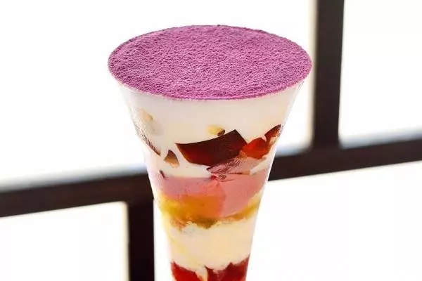 期間限定で提供される「秋香るお芋と林檎パフェ」は、りんごや芋など、秋らしい素材をふんだんに使ったパフェ。鮮やかな紫芋パウダーのかかったメレンゲの先には、紅茶のゼリー、林檎のグラニテ、芋の甘露煮、紫芋ティラミスなどを重ねた。