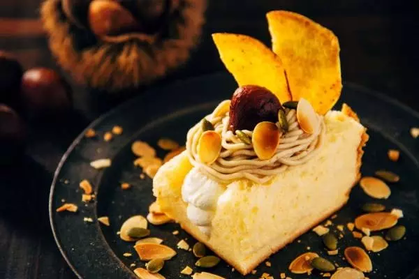 「自家製豆腐のシフォンケーキ 和栗クリーム添え」は、自家製豆腐を使ってしっとりと仕上げたシフォンケーキに、和栗クリームと生クリームを添えた1品だ。 アーモンドとさつまいもチップスを散らし、香ばしさもプラスしている。