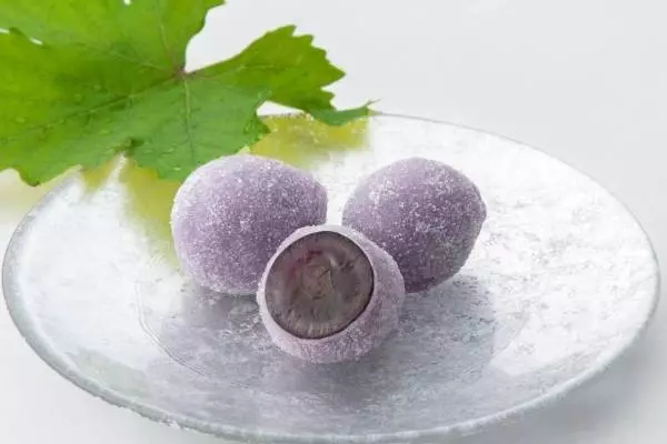 口に入れると、砂糖でしゃりっと仕上げた求肥の中から、オーロラブラックの果汁があふれだし、ジューシーな味わいを楽しむことができる。マスカット オブ アレキサンドリアとはひと味違ったフレーバーをぜひ体感してみて。