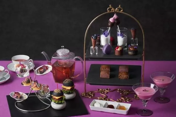 また、軽食メニューには、真っ黒のバンズで挟んだ熟成ミニバーガーや根セロリとビーツの冷製スープなど“バイオレットと黒”を基調にしたメニューがラインナップ。ドリンクは、24種をおかわり自由で楽しめ、コーヒーや紅茶、ハーブティーなどに加えて、ノンアルコールカクテル「モクテル」をフリーフローで味わえるプランも展開する。