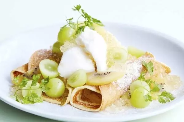 今まさに旬を迎える“ぶどうの女王”シャインマスカットを主役にした新作メニューの中でもメインとなるのが、「シャインマスカットとクレームダンジュのパンケーキ」だ。パンケーキは薄めに焼き上げてからロール状に巻き、フレッシュなシャインマスカットと優しい口当たりのクレームダンジュをトッピング。仕上げにゴールデンキウイとレモンソルベを添えた、果実感溢れるジューシーで爽やかな味わいの一皿となっている。