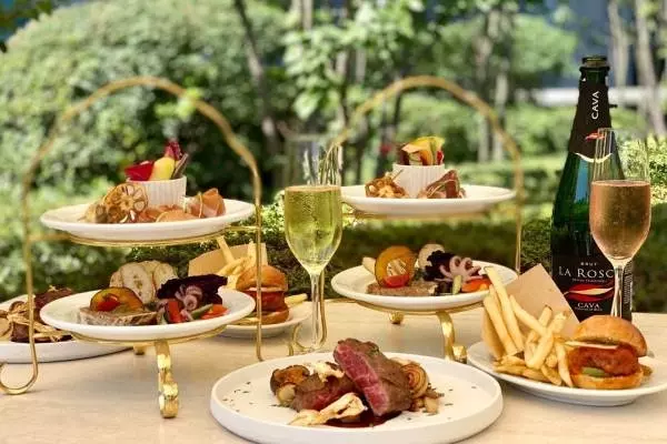 「ハイティー テラス ナイト」は、アフタヌーンティースタンドにフードを盛り合わせたハイティースタイルの食事と、スパークリングワインなどのフリーフローが同時に楽しめるプラン。秋の夜長に、店舗3Fの開放的なルーフトップテラスで、優雅な食事とお酒を堪能することができる。