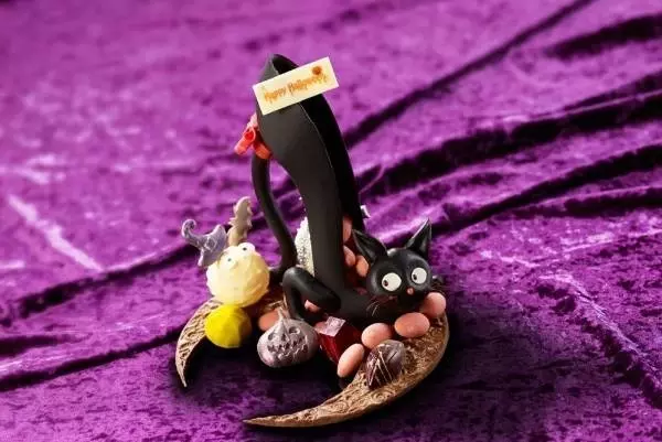 ハイヒール型の黒猫の周りには、ストロベリーチョコレートでコーティングしたアーモンドやボンボンショコラをあしらい、華やかに仕上げた。底には、三日月のチョコレートを敷き、ジャック・オー・ランタンのデコレーションでハロウィンムードを高めている。
