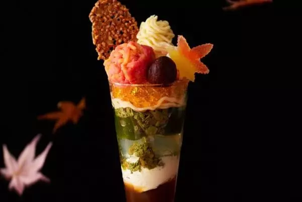 “京都の四季を大切にする”をコンセプトに考案された「もみじ抹茶パフェ」は、抹茶餡の紅葉きんとんや紅葉ゼリー、栗の渋皮煮、さつまいもクリームといった秋の味覚をふんだんに重ねた新作パフェ。