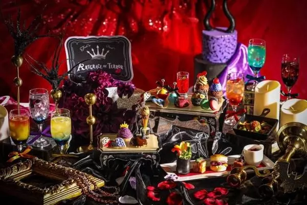 「ヴィランズのラグジュアリースイーツ」では、ブラックデビルシューやヴィランズカップケーキ、闇の女王特製チョコムース、毒リンゴパイなど全18種の多種多様なスイーツを主役に、妖艶なカラーでヴィランズ たちを表現しウェルカムドリンクや、赤や紫色の食材を効果的に取り入れた全6種のフードメニューなどが堪能出来る。