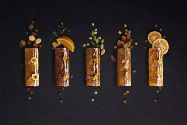 小麦を使わず、チョコレートとアーモンドを組み合わせて焼き上げたケーキをベースに、5つのフレーバーを加えることでオリジナリティ溢れる味わいに。フレーバーは、ヘーゼルナッツ、チョコレート、ピスタチオ、アーモンド、柚子を用意し、それぞれ個包装で箱の中に収められている。