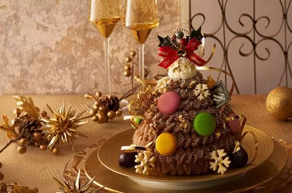 「パティスリーカメリア銀座」からは、モンブランをクリスマスツリーに仕立てたケーキ「モンブラン・ツリー」が発売される。高さ約20cmにも及ぶモンブランを彩るのは、パステルカラーのマカロンや、ゴロゴロした大粒の栗など。真っ白な"雪の結晶"や、白いパウダーがふりかけられた、まさにクリスマスらしいケーキだ。