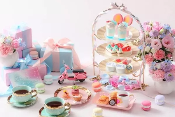「プリンセスアフタヌーンティー~ローマの休日~」は、イタリア王女が過ごす、ローマでの休日がテーマ。ティースタンドに並ぶのは、パステルピンクやパステルブルー、ホワイトカラーを使用した、心躍るスイーツだ。