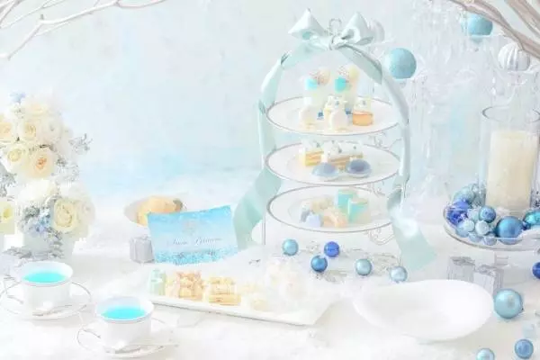 登場するメニューは、ひんやりと冷たい雪や氷を彷彿とさせる、“ブルー&ホワイト”カラーで統一。スイーツ以外のメニューにもこだわっており、ファーストドリンクにはブルーのバタフライピーティーを、ファーストディッシュには真っ白なヴィシソワーズを提供する。