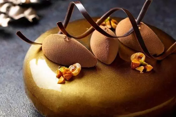ツヤツヤとしたチョコレートの表面に金色のスプラッシュ模様が施されたケーキは、その名も「ダークミラーケーキ」。シナモンやクローブなど、スパイスがほんのりと香るミルクチョコレートムースの真ん中に、カラメルバナナとパッションフルーツを挟み、仕上げにマスカルポーネクリームをトッピングした。