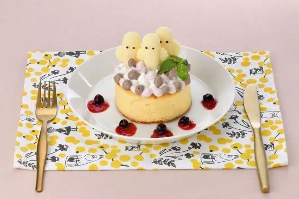 “リトルミイ”をイメージした、ピンク色の木苺クリームをたっぷりとのせた「リトルミイ たっぷり木いちごソーススフレパンケーキ」、“スナフキン”のデコレーションと共に、森に見立てた濃厚なガナッシュクリームを飾った「スナフキン 森のチョコレートスフレパンケーキ」、そしてタピオカ粉100%で作成した、もちもち食感の“ニョロニョロ”が並ぶ「ニョロニョロ お祝いスフレパンケーキ」の全3種がラインナップする。