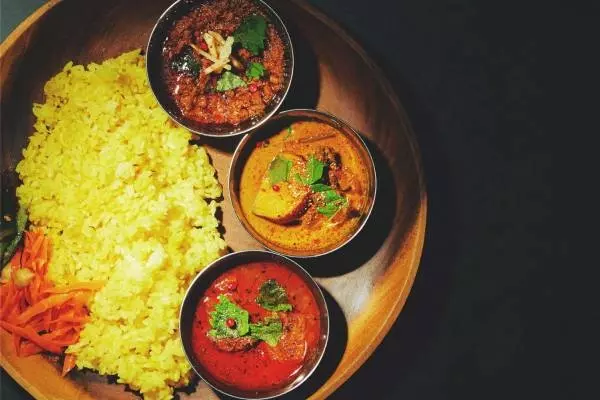 また、粗挽きラム肉をワインとトマトで煮込んだ「ラムキーマカレー」や、インド西部ゴア州発祥の角煮カレーをアレンジした「ポークビンダルーカレー」など、定番メニューもラインナップ。「南越式さつまいもチキンカレー」と合わせて、2種盛りや3種盛りで楽しむこともできる。