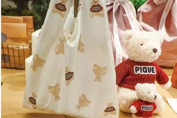 2020年クリスマス限定で発売されるエコバッグは、温かみのあるアイボリーに、柔らかなタッチの“ベア”を散りばめた愛らしいデザイン。ランダムで混じる“赤セーター”のベアには、“pique”のロゴをあしらうなど、ブランドの世界観をさり気なく落とし込んでいるのがポイントだ。サイズは、ちょっとしたお買い物にぴったりな、コンパクトな1サイズのみの展開となる。
