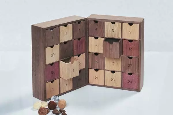ブラジルの希少な木材であるパープルハートやウォールナット、オーク、チェリーといった様々な素材を使用したボックスは、寄木細工の職人がひとつひとつハンドメイドで作り上げたもの。クリスマスまでの日数を数えながら開けていく全24個の引き出しの中には、メゾンカカオの「生トリュフ」や「生チョコクッキー」、「ダマンド・ショコラ」など、新作を含む24個のチョコレートスイーツがおさめられている。