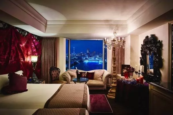 ホテルインターコンチネンタル東京ベイの「ヴィランズルーム」は、“ヴィランズ(悪役)の棲み処”をコンセプトに、ゴシック調のインテリアを並べたゲストルーム。紫や黒を基調とした部屋の中に、ブラック&ゴールドのデコラティブなミラーや、モノトーンの花柄ウォール、アンティーク調のライトスタンドなどを配置し、ミステリアスなムードに仕上げている。