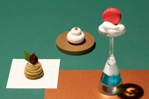 たとえば「初日の出マカロン」は、メレンゲでグラフィカルに表現した雲に、真っ赤に染まる日の出に見立てたラズベリーマカロンを合わせて、初日の出をイメージしたマカロン。初日の出を眺めた後はグラスを返し、ブルーキュラソーゼリーとホワイトカカオバターで出来た富士山を逆さ富士にしていただく、縁起の良い一品だ。