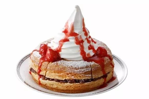 ほかほかのデニッシュパンに小倉あんをたっぷりとサンドした和風シロノワール「小倉ノワール」が、季節限定で再登場。まろやかなソフトクリームと甘酸っぱい苺ソースが絡みあい、小倉あんのほっこりとした甘さをより一層際立たせる。