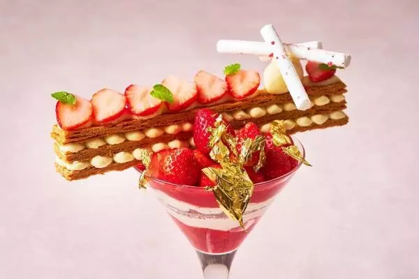 一方「大人のストロベリーミルフィーユパフェ」は、トップに長さ約20cmのミルフィーユを大胆にのせたパフェ。グラスには、練乳のクレームシャンティやいちごのソース、バニラアイスクリーム、そしていちごのコンポートを重ね、チョコレートのクランブルでアクセントを。その上には、フレッシュないちごや金箔をトッピングして、華やかに仕上げた。