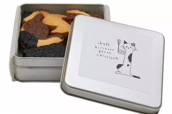 「ukafe 三毛猫クッキー」は、三毛猫をはじめ、愛らしい10匹の猫型クッキーを楽しめるアソート缶。素材には、厳選した国産小麦100%の薄力粉、牧草をエサとする牛のミルクから作られたグラスフェッドバター、そして濃厚な奥久慈卵を採用している。メープルシュガー、和三盆、竹炭パウダー、ココアを加えることで、白猫、茶猫、黒猫、三毛猫の4種類を表現した。