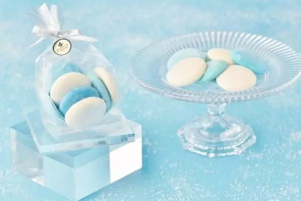 「マカロンラスク」は、雪のように真っ白なマカロンラスクと淡いパステルブルーのマカロンラスクをセットにしたカラフルなスイーツギフト。袋にはきらめくシルバーリボンを飾り、クリスマスのプチギフトや手土産にもぴったりな仕上がりとなっている。